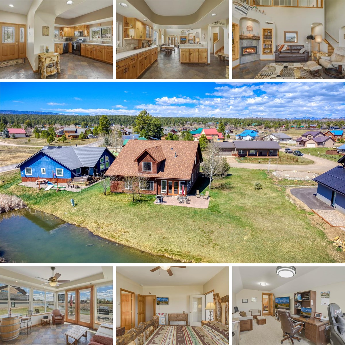 Imagine your days spent on the lake or relaxing on your back patio, surrounded by breathtaking mountain scenery. Welcome to this charming home nestled directly on Hatcher Lake in the highly sought-after Pagosa Lakes community. This beautifully maintained 2,792-square-foot residence features 4 bedrooms and 3 full bathrooms, including two primary suites—one conveniently located on the main level and the other on the upper level. Ideal for multi-generational living or simply enjoying extra space, the home offers room for everyone to spread out and relax. The main level boasts an open-concept living and dining area with elegant slate flooring, plus a bright sunroom for year-round enjoyment. Two additional bedrooms share a full bathroom and sit just across the hall from the laundry room, making single-level living effortless. Upstairs, the spacious primary suite is adjacent to a versatile bonus room perfect for a home office, guest space, or hobbies. Proudly maintained by the current owners, this home includes a newer roof installed in 2024, updated kitchen appliances, and a freshly stained exterior. Close to bike trails, National Forest access and to the recreation center (for an additional fee.) Ready for its next chapter—schedule your private showing today!