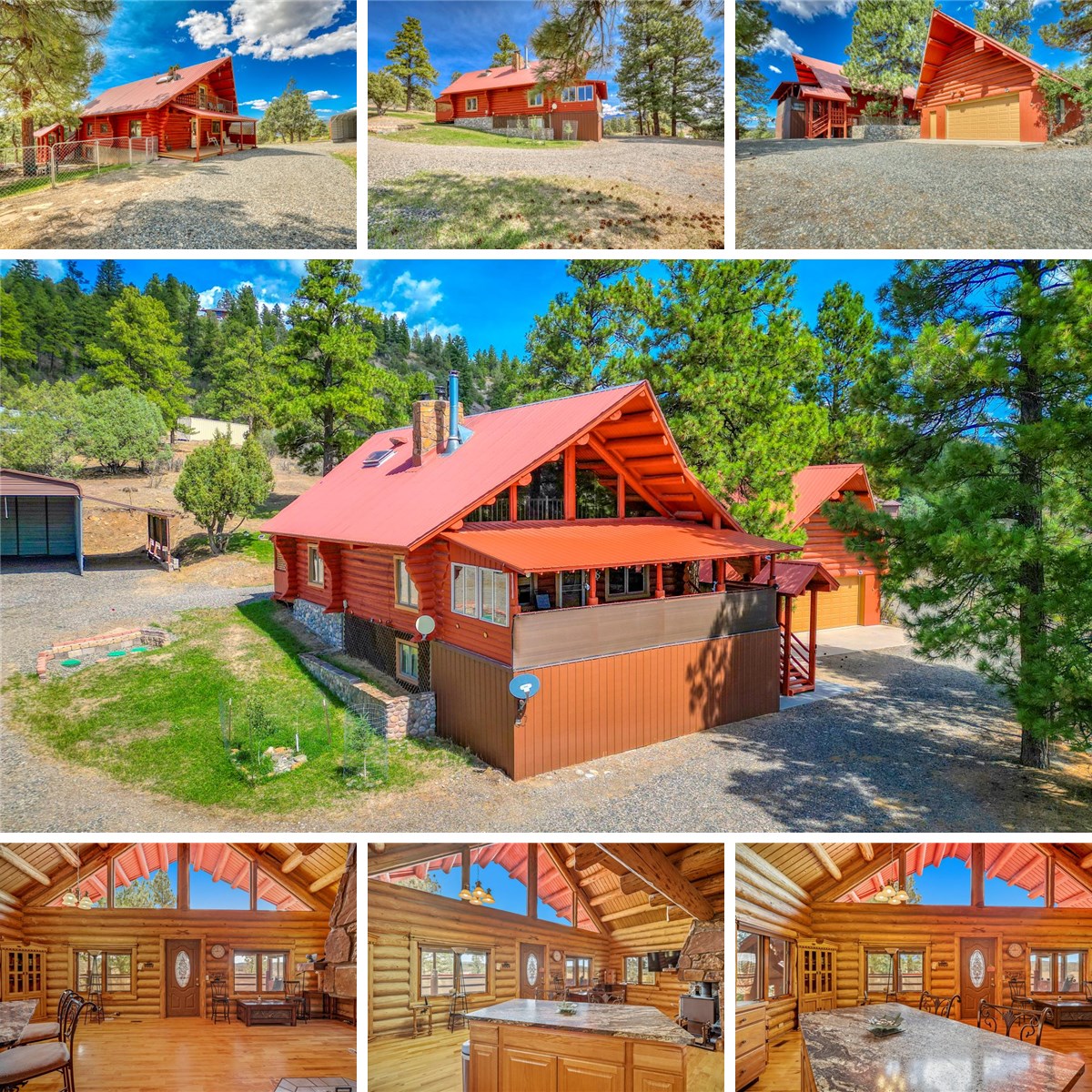 Outdoor living is a dream with three covered decks offering panoramic vistas. The expansive circular driveway leads to ample parking, including a two-car garage, four carports, and additional RV parking. Located on paved roads, this home is moments away from convenient shopping and dining, offering the perfect blend of secluded living and easy access.